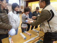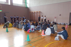 | 体育館の中に避難者が避難する区画を作ります。 | AED体験。今回は消防署員の方に指導をお願いしました。 | 緊急時の救急救護訓練。ラップを使う方法を体験してもらいました。 |